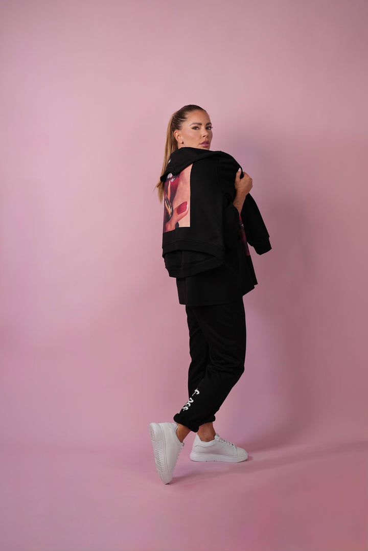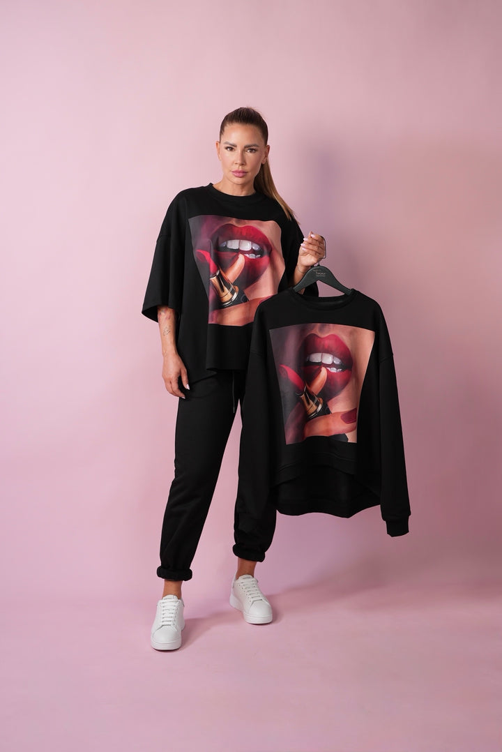 Výrazný streetwear kousek, který spojuje pohodlí a odvážný design. Černá unisex mikina v oversized střihu upoutá velkoformátovým potiskem smyslných rtů s červenou rtěnkou – symbolem sebevědomí, vášně a originality.